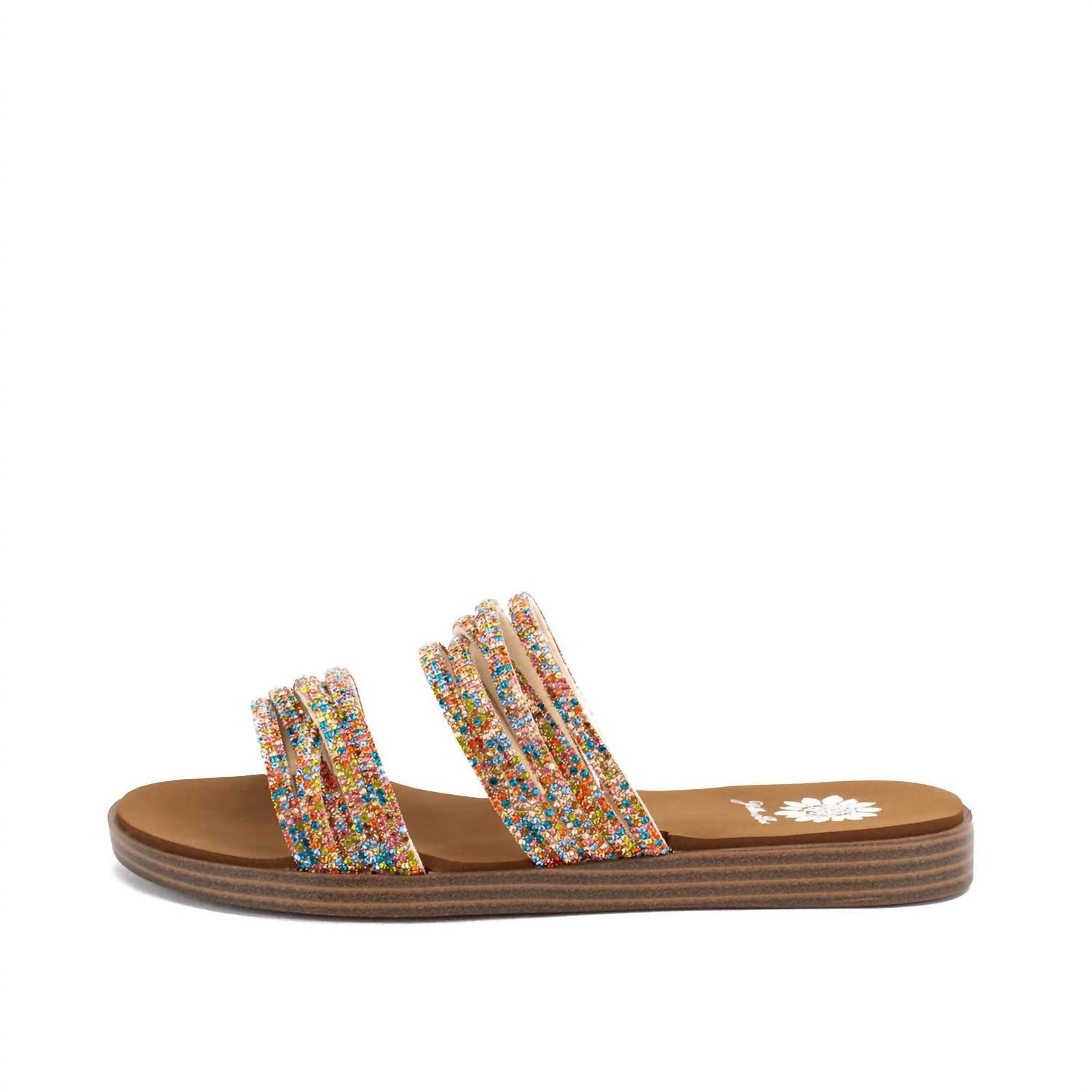 Esta sandália de perfil baixo apresenta tiras brilhantes semelhantes a pulseiras e um corte elegante. Possui bico arredondado, salto de 1,9 cm e plataforma de 1,2 cm. Confeccionada em tecido, com palmilha exclusiva de EVA Yellow Box e solado de borracha.
