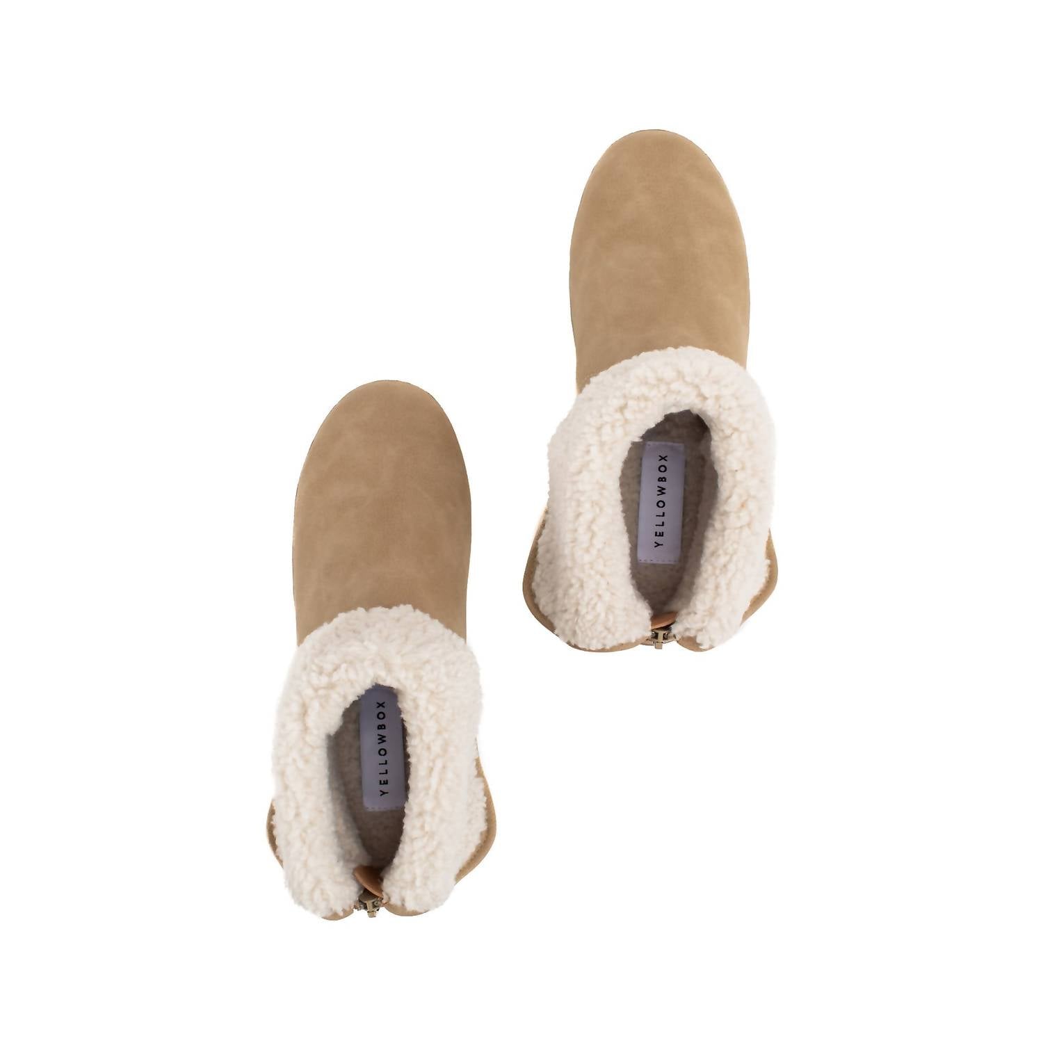 Diga olá à bota perfeita e mais versátil. A altura do tornozelo facilita a transição do dia para a noite. Use-a com sua calça jeans skinny favorita e camiseta para um look mais descontraído, ou combine-a com seu minivestido e jaqueta favoritos para uma saída à noite. Descubra a Bota Melisa Wedge Feminina da YELLOWBOX, perfeita para a transição para os dias frios. Esta bota cor de areia apresenta um bico arredondado estiloso e um cano totalmente forrado em pele de carneiro sintética, que pode ser usado enrolado ou dobrado para revelar o punho de pele sintética felpuda. O fecho de zíper traseiro facilita o calce, enquanto o salto anabela oculto oferece uma discreta elevação de 3,8 cm. Com cabedal em couro sintético e solado de borracha, estas botas garantem conforto com palmilha acolchoada com suporte suave para o arco do pé.