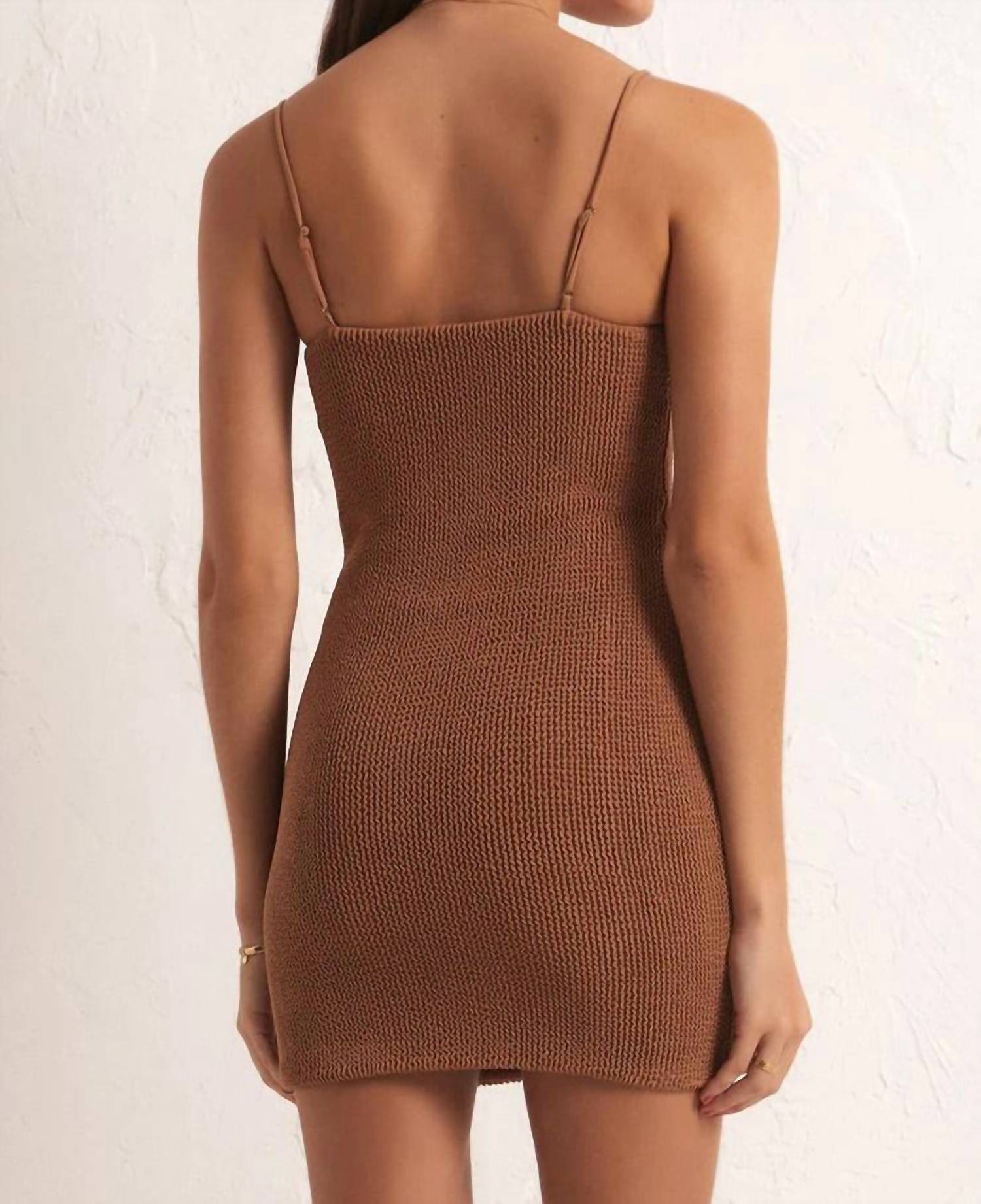 Um vestido curto e arejado para os dias mais quentes. Este vestido justo apresenta alças finas elásticas e um decote redondo elegante, confeccionado em malha elástica amassada composta por 97% nylon e 3% elastano. Com fecho pull-on e sem bolsos, este vestido oferece um acabamento elegante com sua estampa sólida. As instruções de cuidado incluem lavagem à mão, secagem na horizontal e ferro em baixa temperatura do avesso ou lavagem a seco, conforme necessário. Fabricado na China para a mulher moderna.