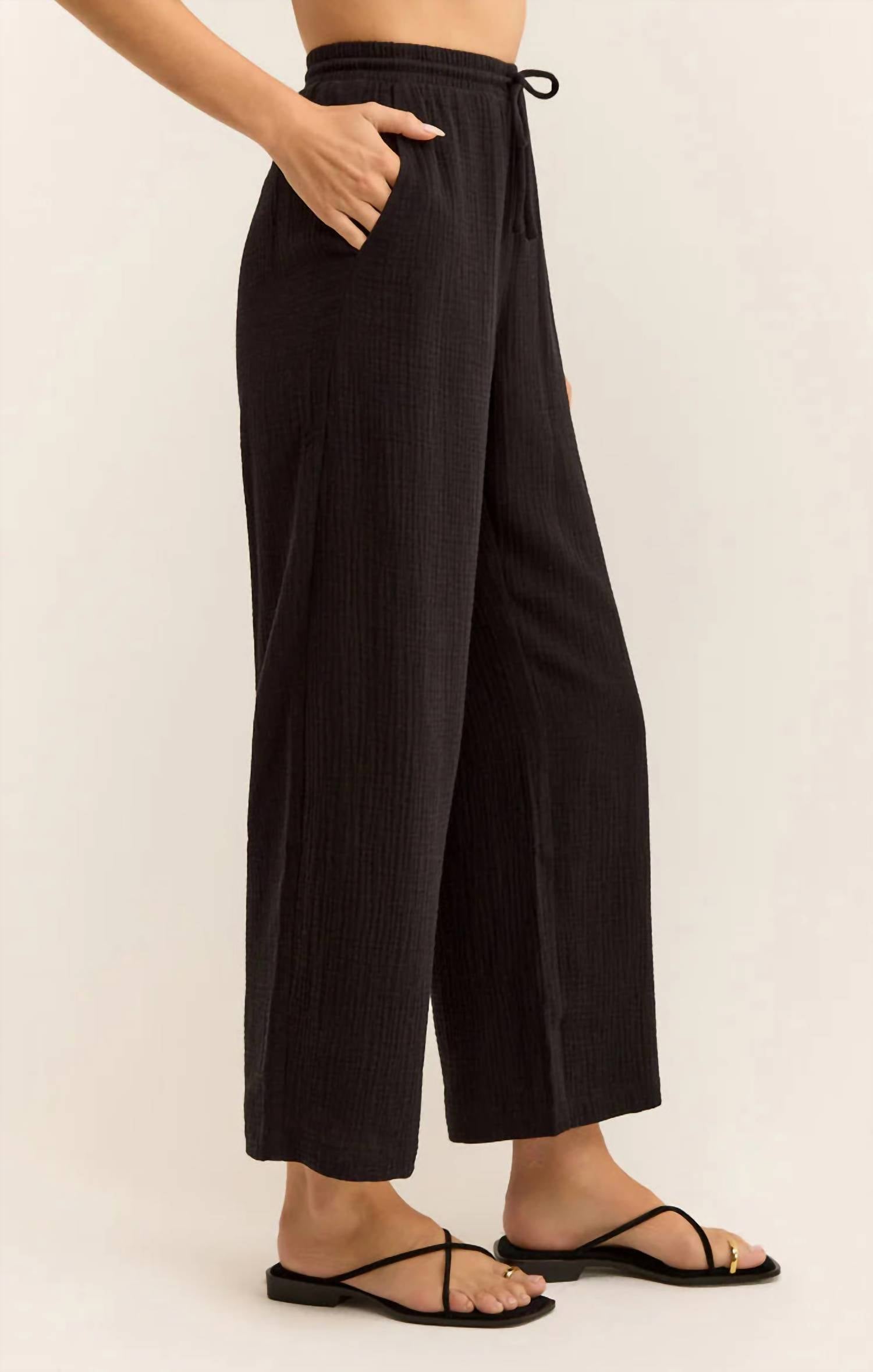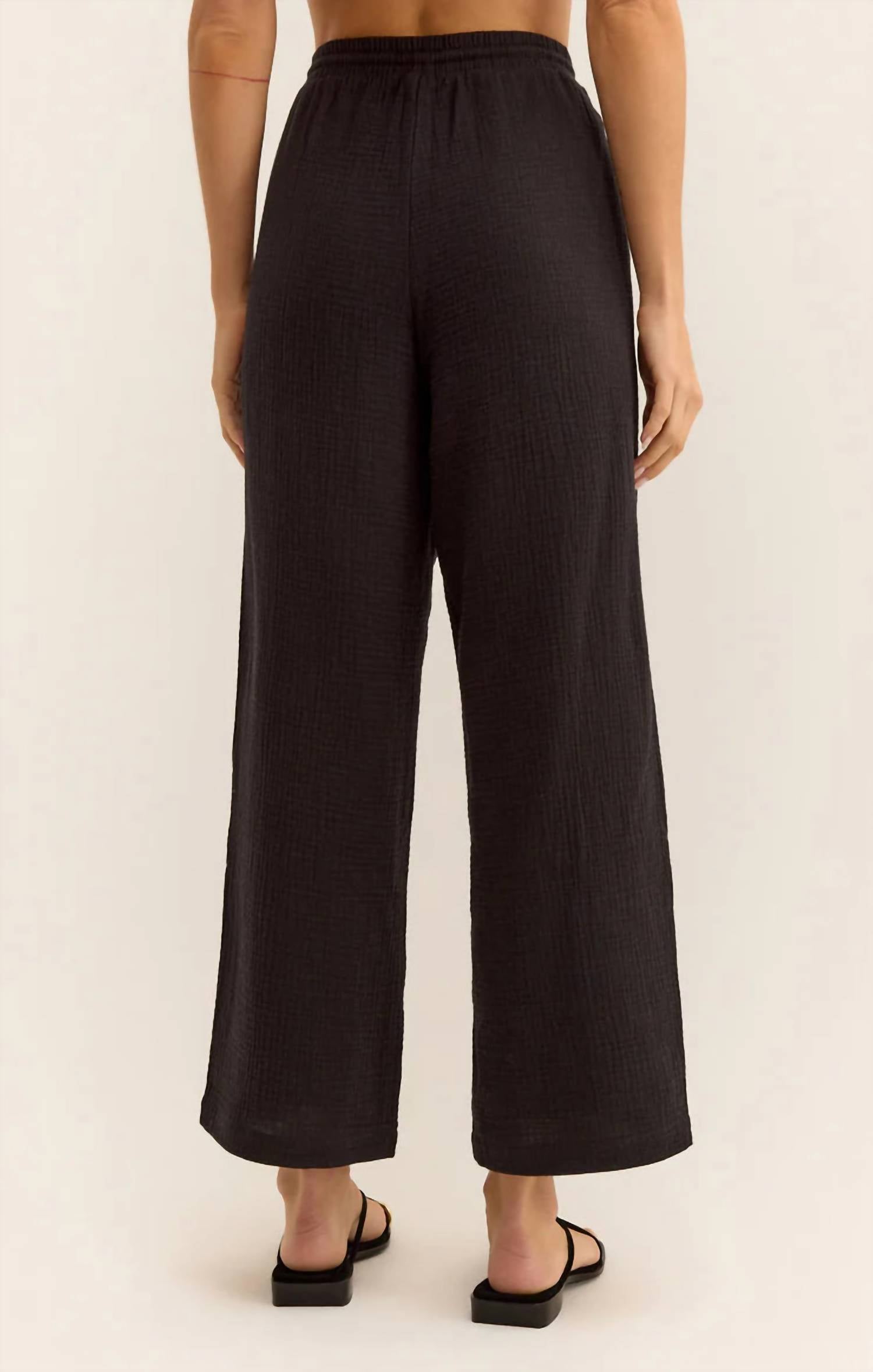 This Pants features a longer inseam, wider waistband and straighter leg. Regular fitDouble Gauze: 100% Cotton. Elastic waist. Tie detail. Pockets. White lined only. Machine Wash Cold, hang to Dry, Steam Only