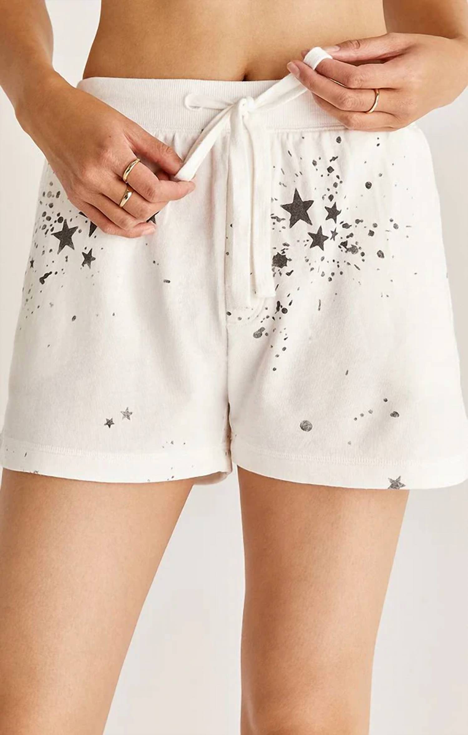 Coloque sua camiseta favorita dentro deste short de cintura alta para uma sensação mais casual e descolada. Apresenta estampa Splatter Star, cós canelado com cordão e bolsos laterais. Conforto e caimento perfeitos. Tecido: 60% algodão, 40% poliéster. Lavagem à máquina. A modelo veste tamanho P.