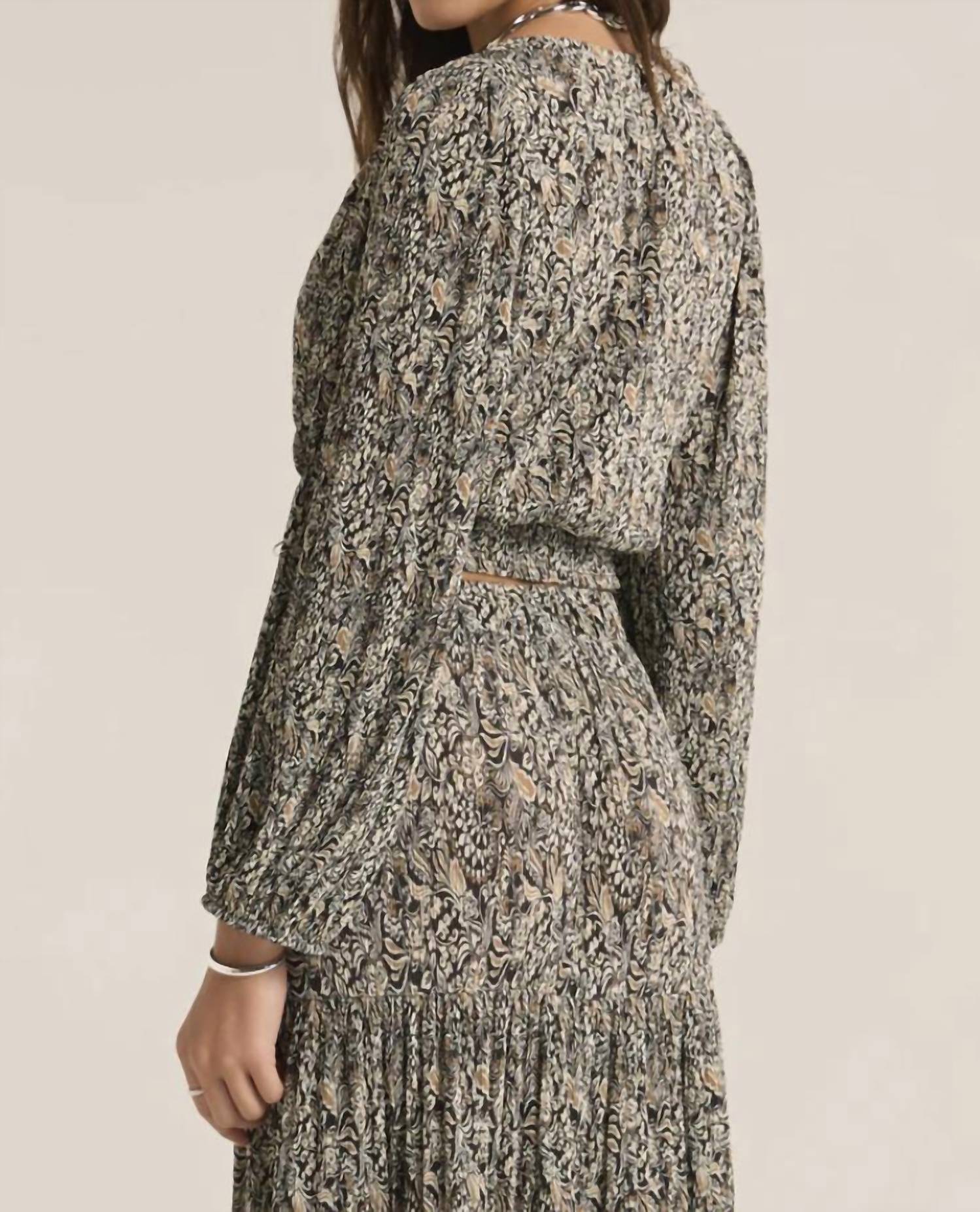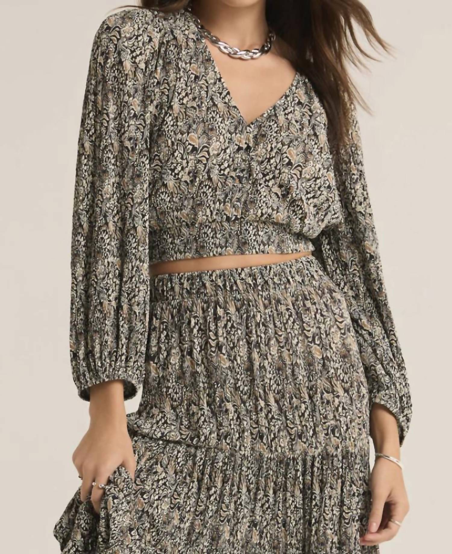 Eleve seu guarda-roupa com o Crop Top Isidoro Reva Block da Z Supply, uma peça chique em preto clássico. Esta blusa estampada apresenta mangas longas e um decote em V charmoso com detalhes em botões, perfeito para qualquer ocasião. Confeccionada em 100% poliéster, possui textura plissada sanfonada para maior dimensão e um prático estilo pull-on. Cuidar desta peça elegante é fácil: lavar na máquina e secar na horizontal.