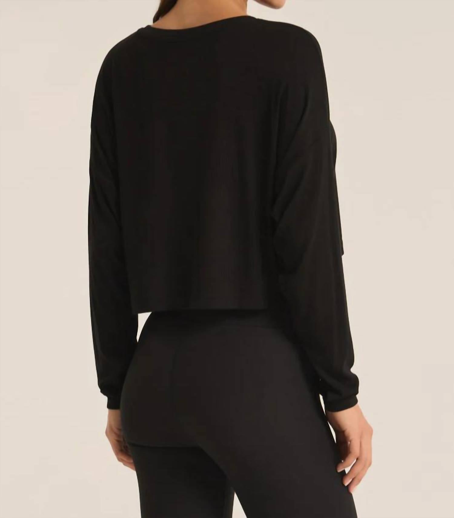 Um top cropped preto chique com mangas compridas e gola redonda, confeccionado em uma confortável mistura de 95% rayon e 5% elastano. Seu estilo prático e ombros caídos o tornam ideal para ocasiões descontraídas. Lavar à máquina com água fria em ciclo delicado, secar na horizontal ou no varal e evitar amaciantes.