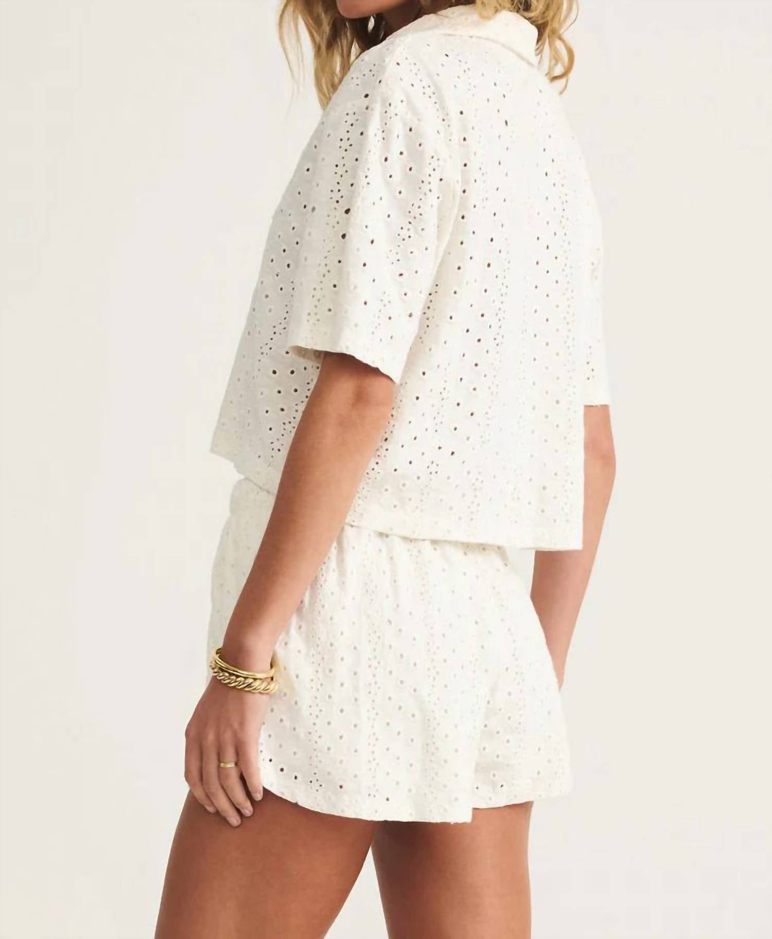 A camiseta de manga curta que você vai querer em todas as cores. A blusa Madrid Knit Eyelet Button Up da Z Supply é uma escolha estilosa para os meses mais quentes. Com mangas curtas e gola clássica, esta blusa é confeccionada em 100% algodão respirável, com acabamento texturizado. Seu caimento solto e detalhes em ilhós a tornam uma peça de destaque para férias ou ocasiões de primavera. Fechamento: Botão. Cuidados: Lavar à mão e secar no varal. O tom off-white complementa perfeitamente a tendência Boho Chic.
