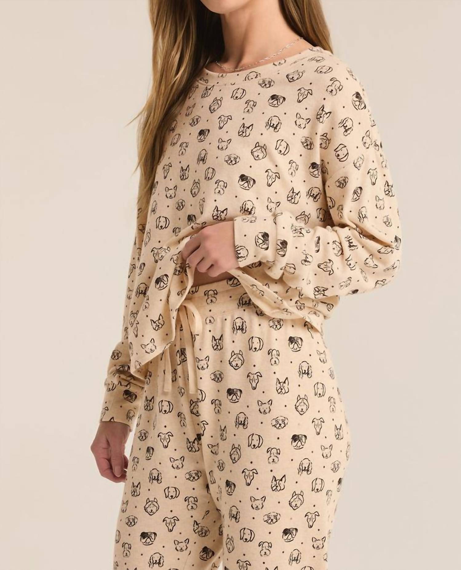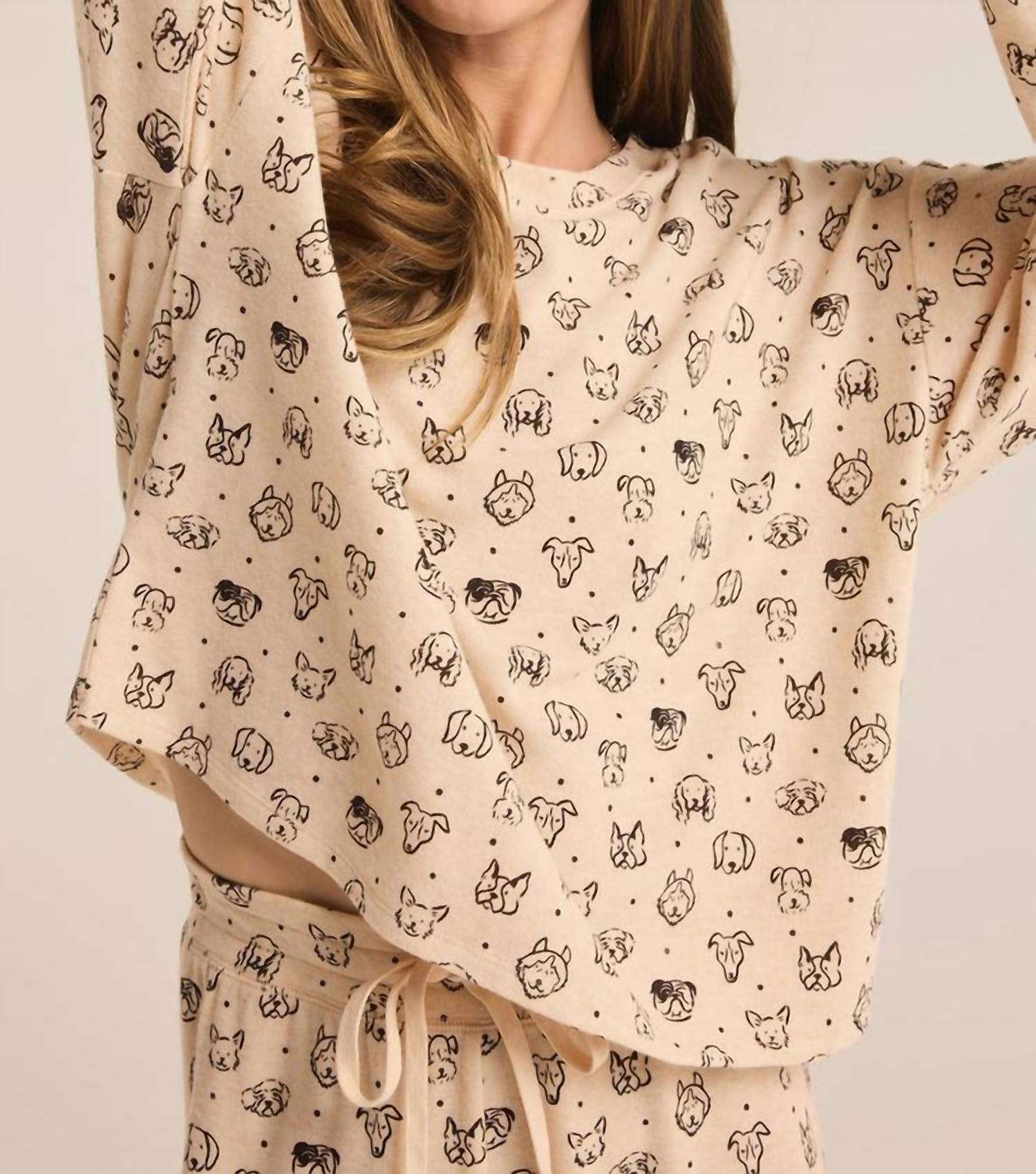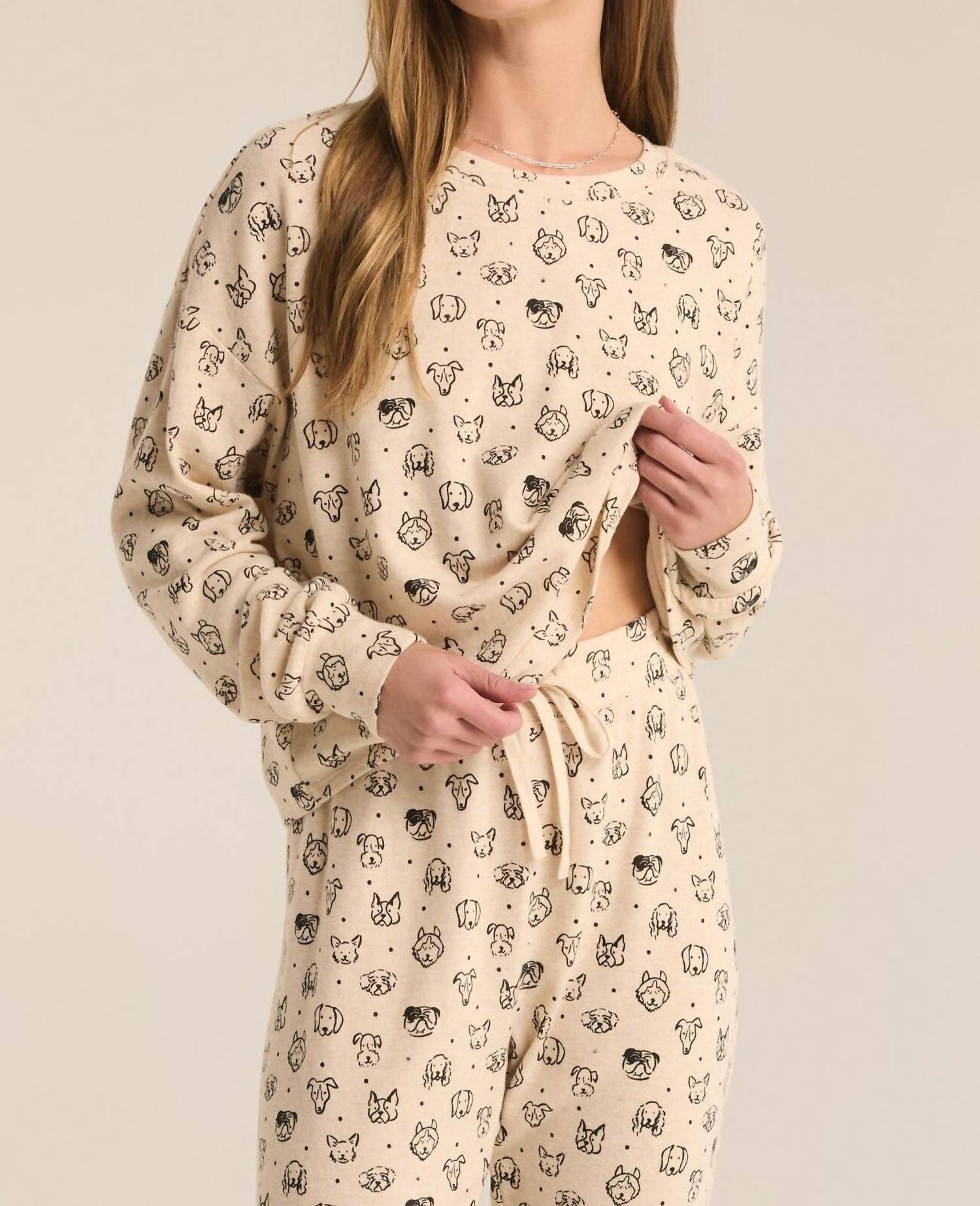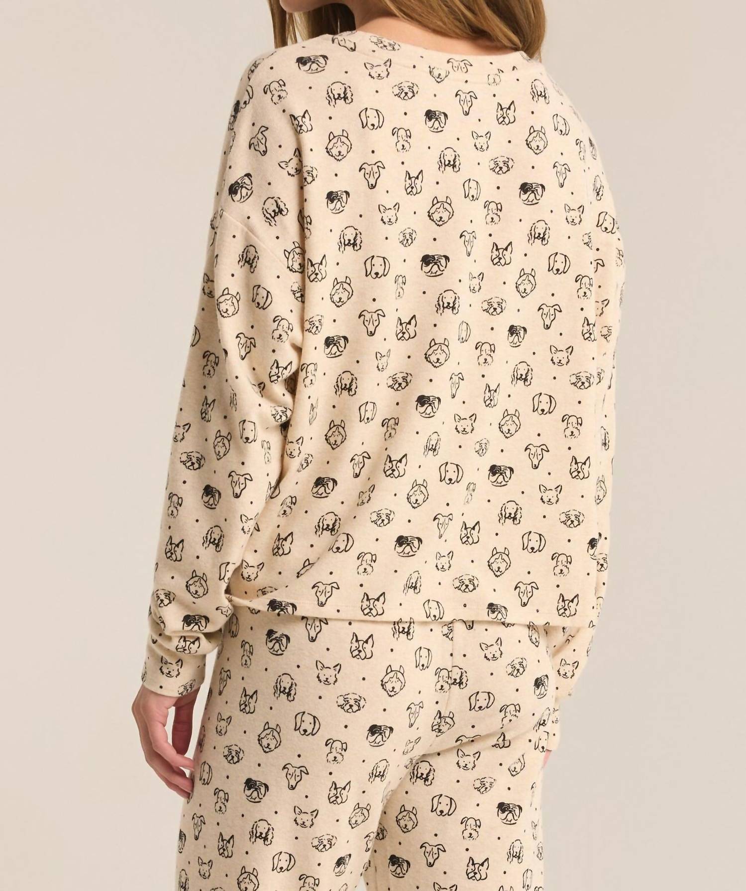 Uma blusa de manga comprida que você pode usar com jeans, saias, bem... quase tudo! Esta blusa de malha escovada, macia e amanteigada, apresenta uma adorável estampa de cachorrinhos natalinos. Possui gola redonda, mangas compridas e modelagem regular. Confeccionada em 57% algodão, 38% poliéster e 5% elastano. Tamanho real.