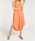 Chic and comfortable sleeveless midi dress in vibrant orange. Made from 100% cotton slub knit fabric, featuring a V-neckline, ribbed trim, side slits, and a raw-edge hem. Designed for women, measures 47 inches in length. Easy to wear with its pull-on closure. Care instructions include machine wash cold on a gentle cycle, with low tumble drying and optional warm ironing.