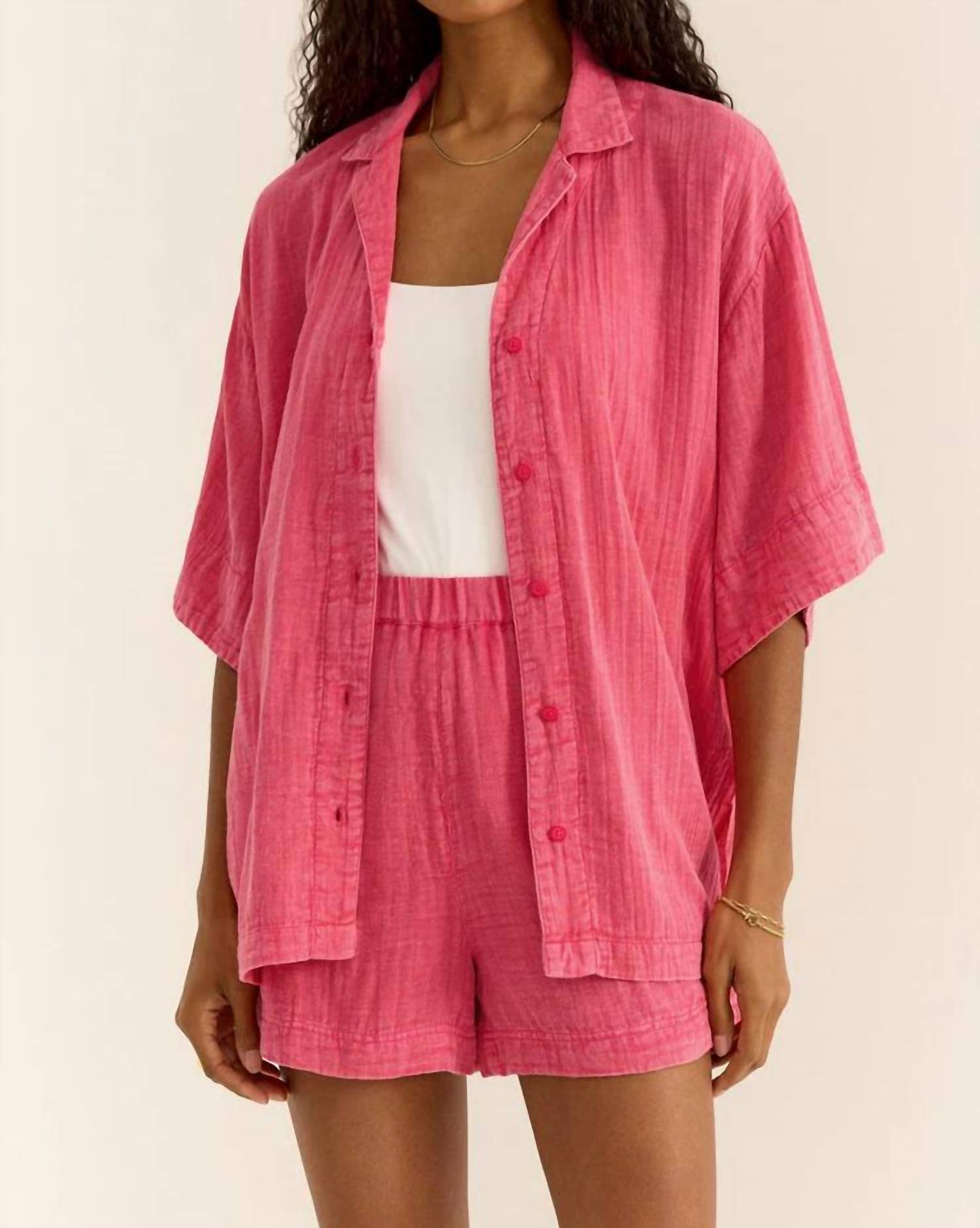 Crinkle cotton: 100% cotton. Collared. Button front. Dropped shoulder short sleeve. Wide hem detail with side slits. Machine wash cold, hang to dry, steam only or dry clean. Relaxed fit. Garment length from shoulder: XS: 26 1/2 inches. S: 27 inches. M: 27 1/2 inches. L: 28 inches. XL: 28 1/2 inches.