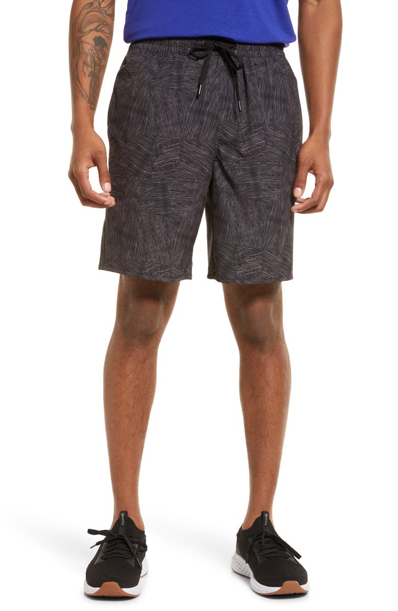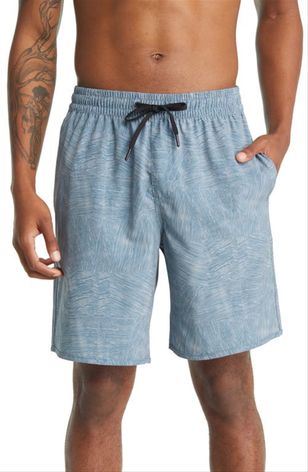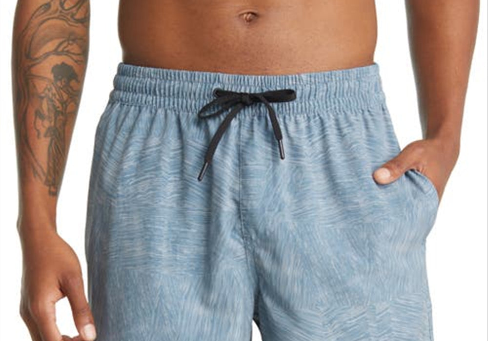 Material de secagem rápida | Estampa de olmo azul-petróleo | Cós com cordão | Ajuste confortável | Tamanho extrapequeno | Bolso traseiro com aba | Tecido de alta qualidade | Disponível na Nordstrom | Marca famosa - Zella | Leve e respirável | Perfeito para atividades aquáticas
