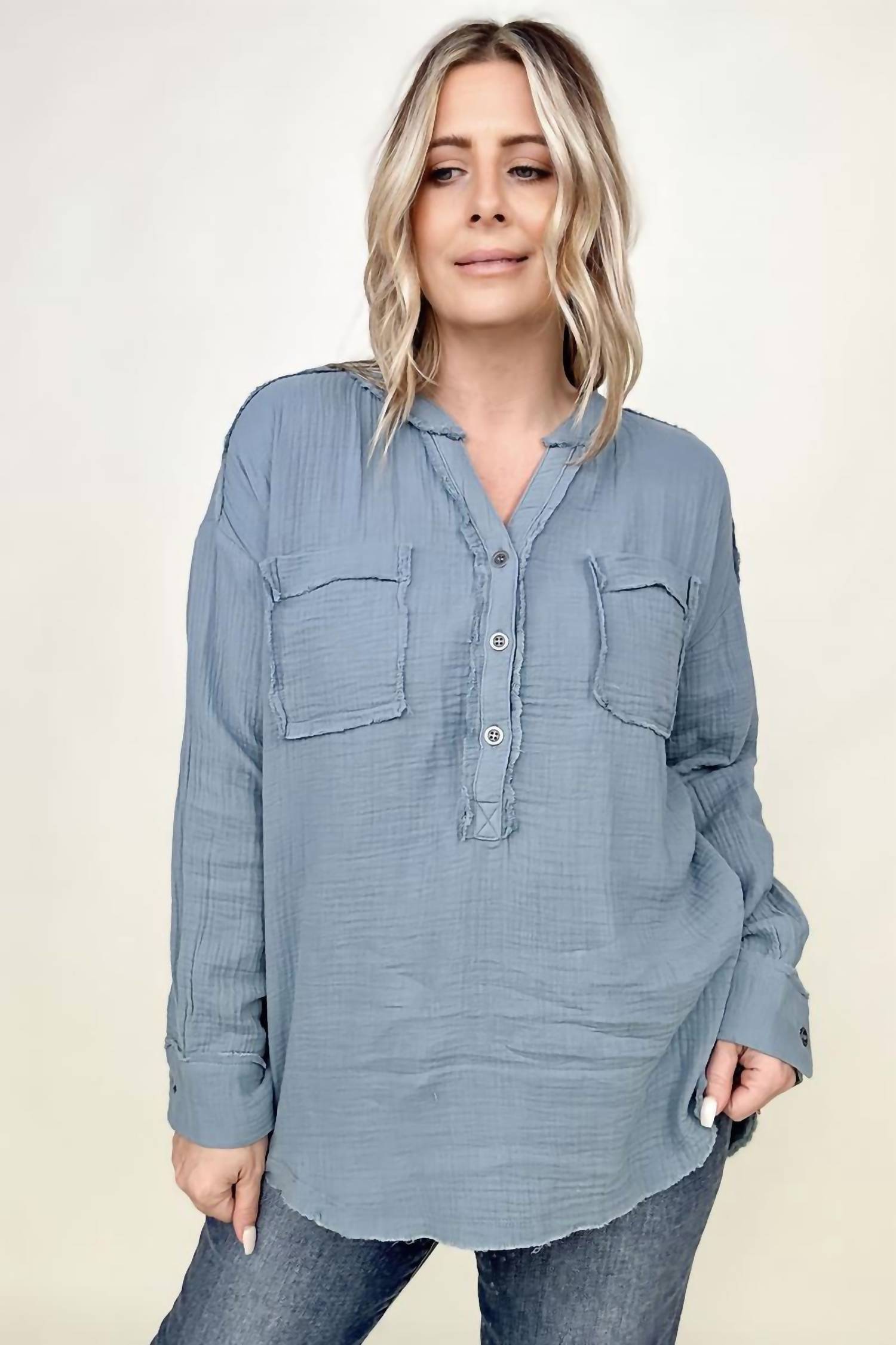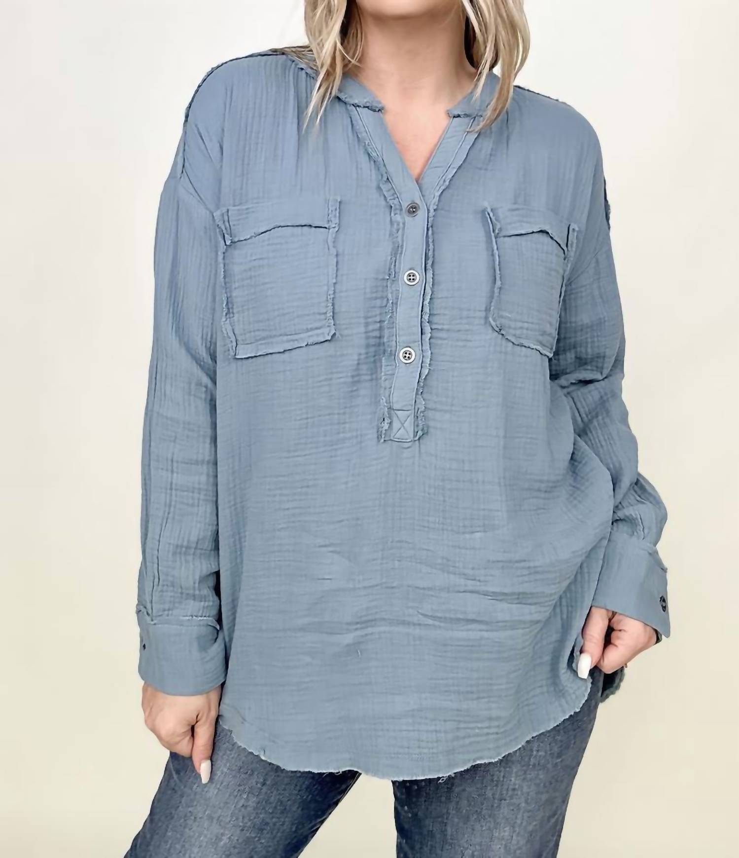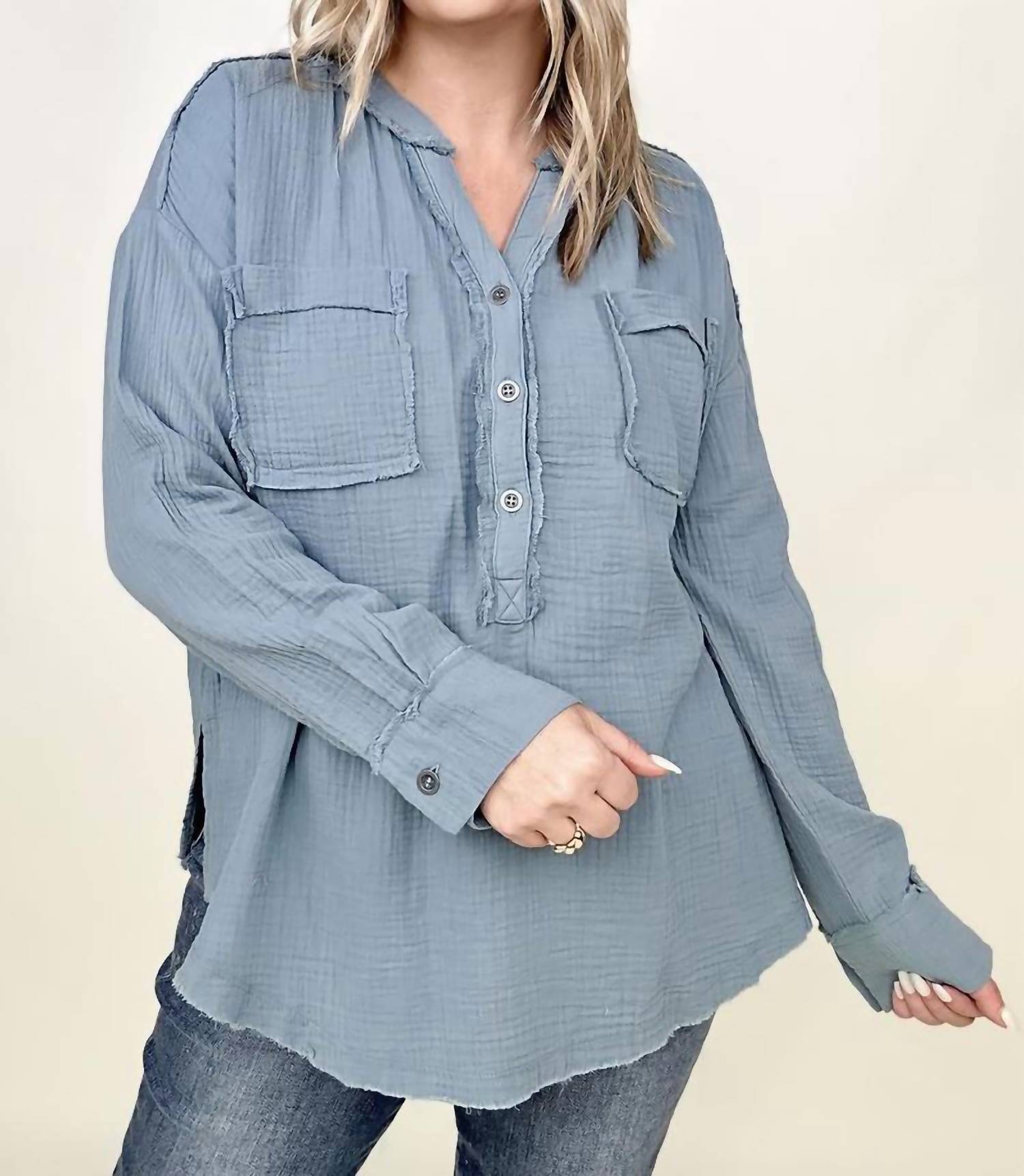 Perfectly tailored and soft to the touch. Introducing the Gauze Split Neck Button Front Top by ZENANA, a casual and relaxed staple for your wardrobe. This long sleeve top is crafted from 100% cotton, featuring a chic drop shoulder design and a 3/4 button Henley neck. The thoughtful details of chest pockets, a side slit, and a high-low hem add functionality and style, making it perfect for a laid-back look. Easy to care for, this solid Sand Beige piece is machine washable. Model Richelle is wearing a size S with a total body length of 26.5" and a bust measurement of 42".